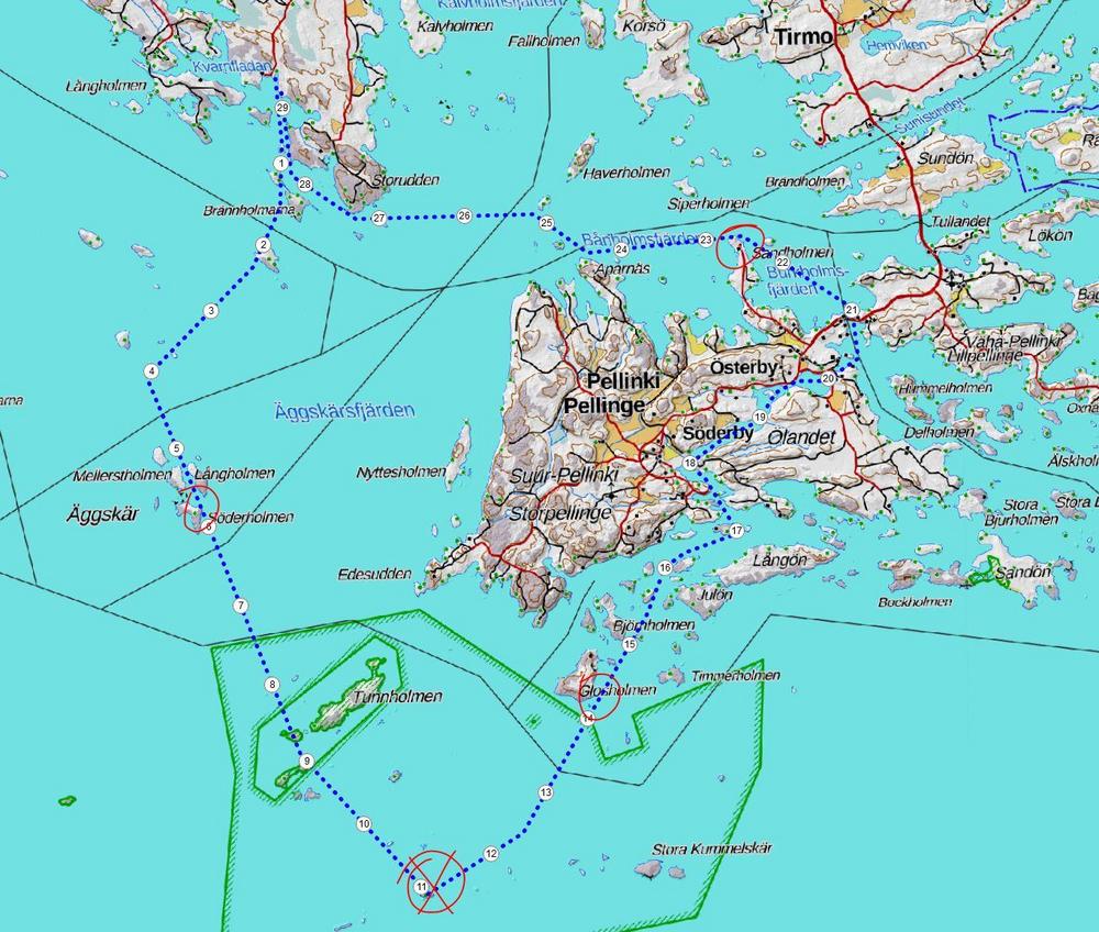 Täältä menemme Pellingin halkaisevan Fladanin kautta (ellei vesi todella matalalla, jolloin kierrämme Ölandetin itäpuolitse) ja pysähdymme vielä Benitan kahvilassa ~10km kohdilla ja lopulta palaamme lähtöpisteeseen jolloin matkaa on kertynyt noin 30km.